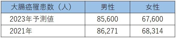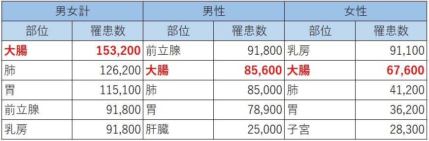(日本のがん統計より引用して作成) しかし、他のがんと比較すると男女ともに大腸癌の罹患数が多いです。